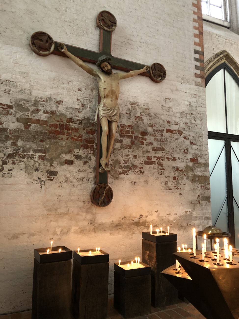 Am nächsten Morgen sind wir dann nochmals in die City gefahren. Es wurde ein recht sonniger Tag in Lübeck. Ein wenig kreuz und quer durch den äußeren Bereich der Altstadt, was teils recht mühsam und auch etwas nervig durch das Kopfsteinpflaster war, welches uns und die Räder ziemlich durchgeschüttelt hat. Wir suchten ein ‚nettes‘ Café für unser Frühstück und wurden auch fündig. Irgendwie war es dann schon fast Mittagszeit, als wir damit fertig waren. Wir stellten die Räder am Ratskeller ab und wollten in die Marienkirche. Offen war sie, aber man muss Eintritt zahlen (2€ pro Erw.) um sich alles ansehen zu können. Wir haben es gemacht und der Einsatz hat sich gelohnt, denn kaum 5 Minuten später begann eine vom derzeitigen Pastor Pfeifer geleitete Führung, die äußerst interessant war. Man merkte richtig wie er dafür brannte, sein vielfältiges Wissen über die Kirche, die Verbindungen zur Bibelgeschichte und zu den Besonderheiten der Lübecker Bevölkerung über die Jahrhunderte hinweg an uns weiterzugeben. Fast eineinhalb Stunden dauerte die Führung und keine Minute davon war verschwendete Zeit.