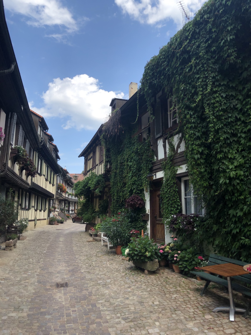 Es war das übliche geschäftige Treiben in der Stadt, aber die Einschnitte durch Corona waren nicht zu verkennen. Einige Restaurants hatten nicht geöffnet und ich fragte mich, ob die jemals in absehbarer Zeit wieder öffnen würden. War früher in der Engelgasse ein Meer von Geranien sowie anderen Blumen und Pflanzen zu sehen, die die uralten Fachwerkhäuser umrahmten und Weinreben, die an den Balken entlang und über die Straße wuchsen, so ist heute noch alles schön, aber eben etwas unscheinbarer. Wir gingen durch die verschiedenen Gassen, durch die Stadttore und zur Klostermühle, deren Mühlrad, vor Jahren noch vom Wasser angetrieben, heute als stilles Zeichen nur noch den Touristen als Fotoobjekt dient. Und trotz aller Vergleiche von früher zu heute – die Stadt ist auf jeden Fall einen Besuch wert.