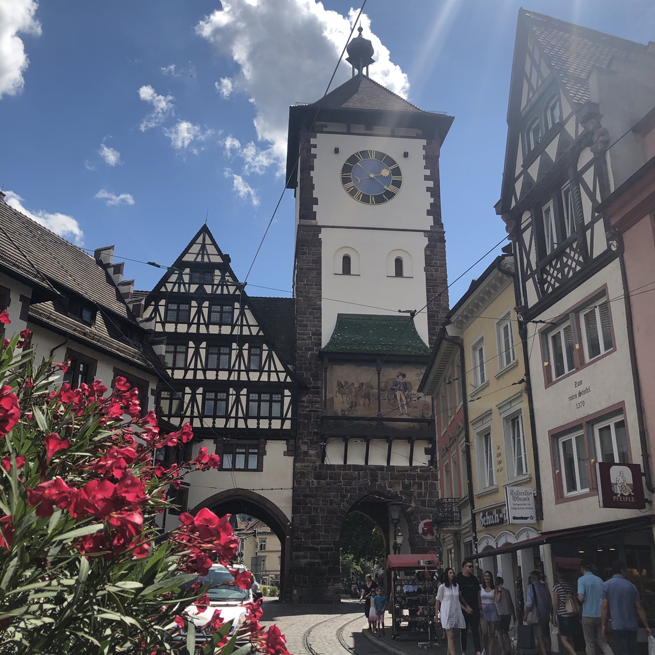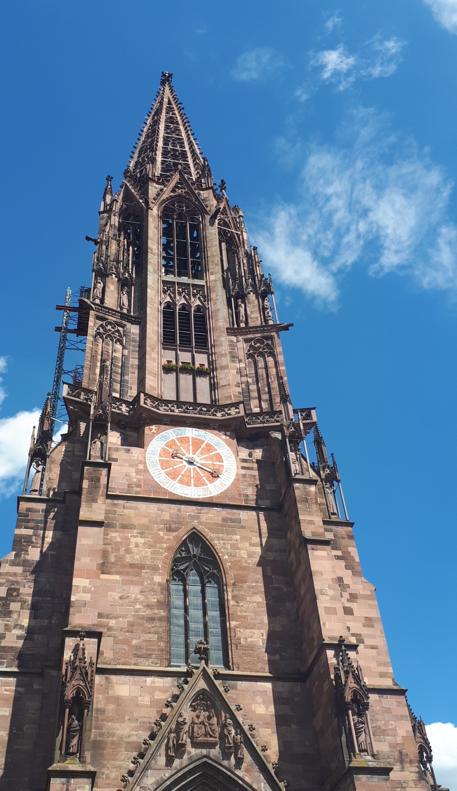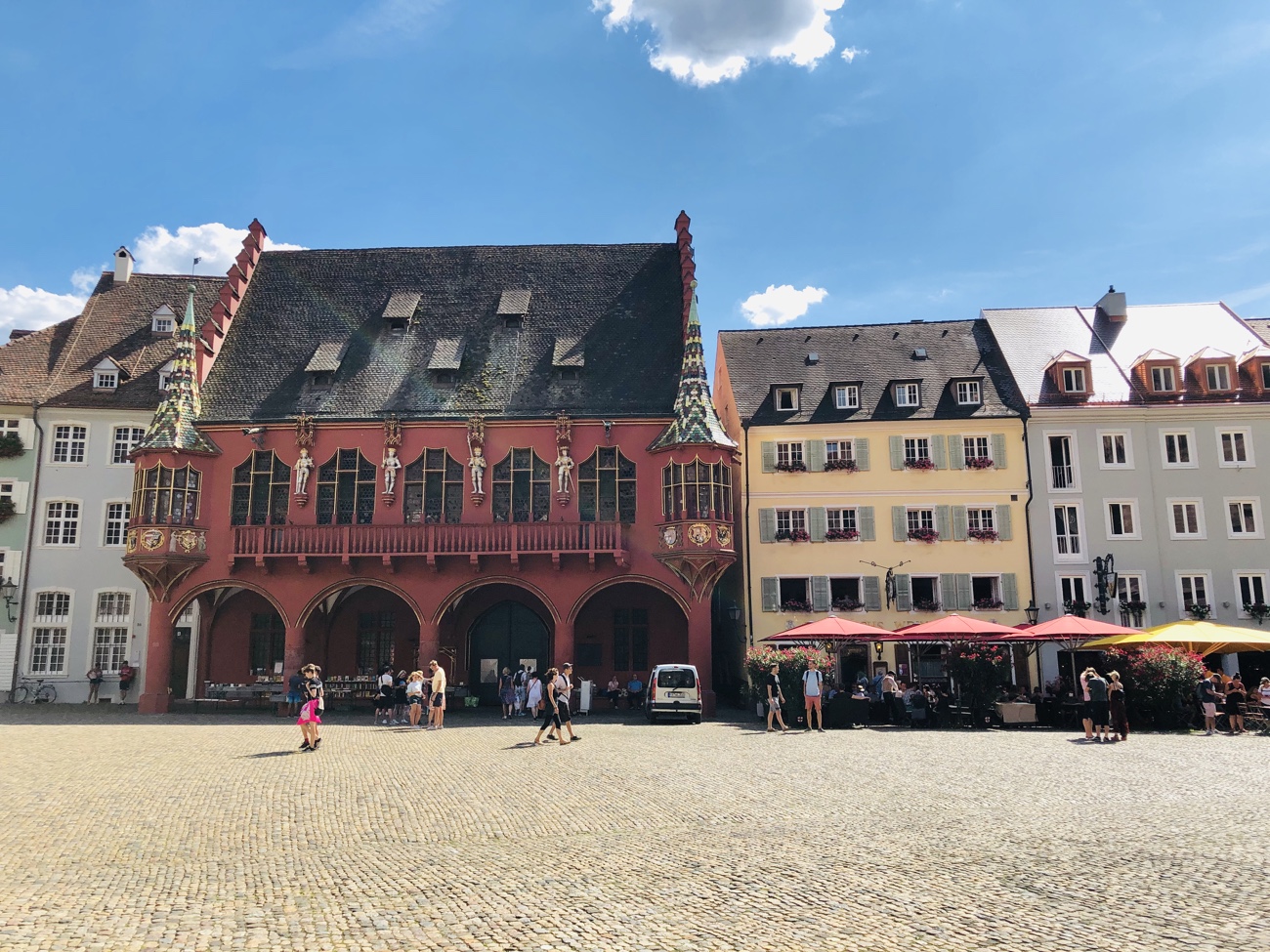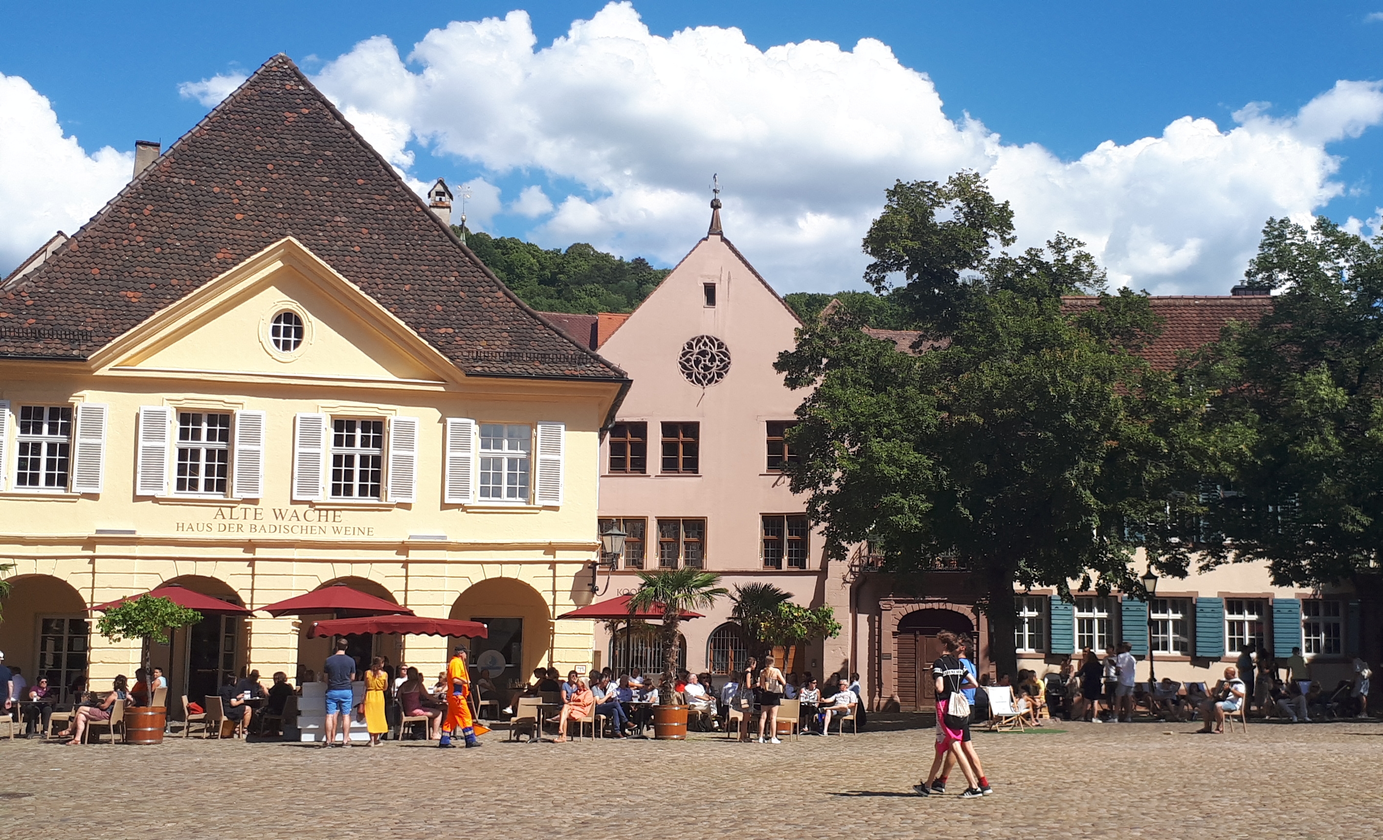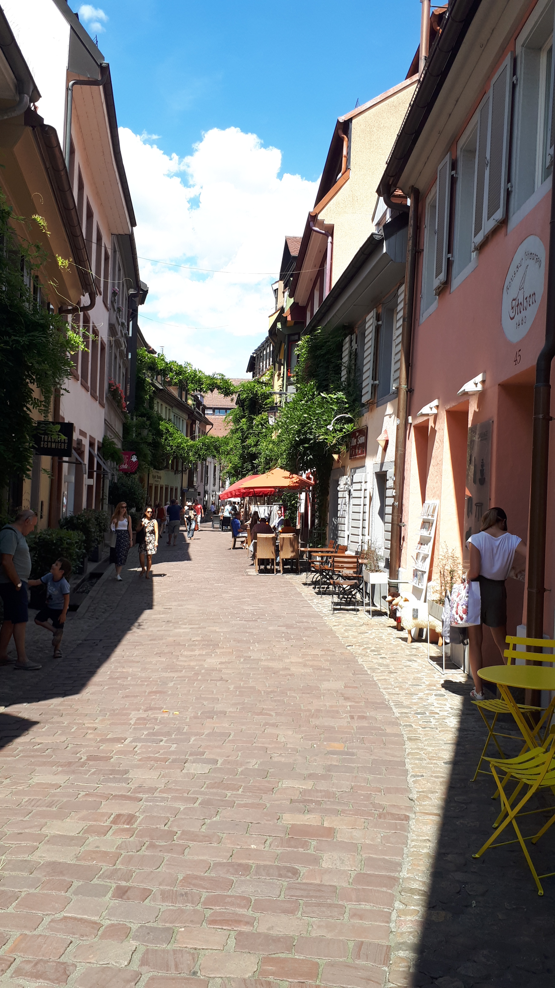 Also fuhren wir, einschließlich unserer Räder, kostenfrei nach Freiburg, stellten wie üblich die Räder ab und schlenderten zu Fuß durch die Stadt. Auch wenn es nur sonnige 26°C waren, war die Stadt doch recht aufgeheizt und voll. Zusätzlich die Straßenbahnen in den breiten Straßen – gefühlt sind wir so viel Rummel nicht mehr gewöhnt ;-). Aber wir fanden auch schöne kleine Gassen und man wird auch fast überall vom „Bächle“ begleitet; einem kleinen flachen Kanal, in dem etwas Wasser fließt und in den viele ihre Füße zum Abkühlen bei einer Pause halten.