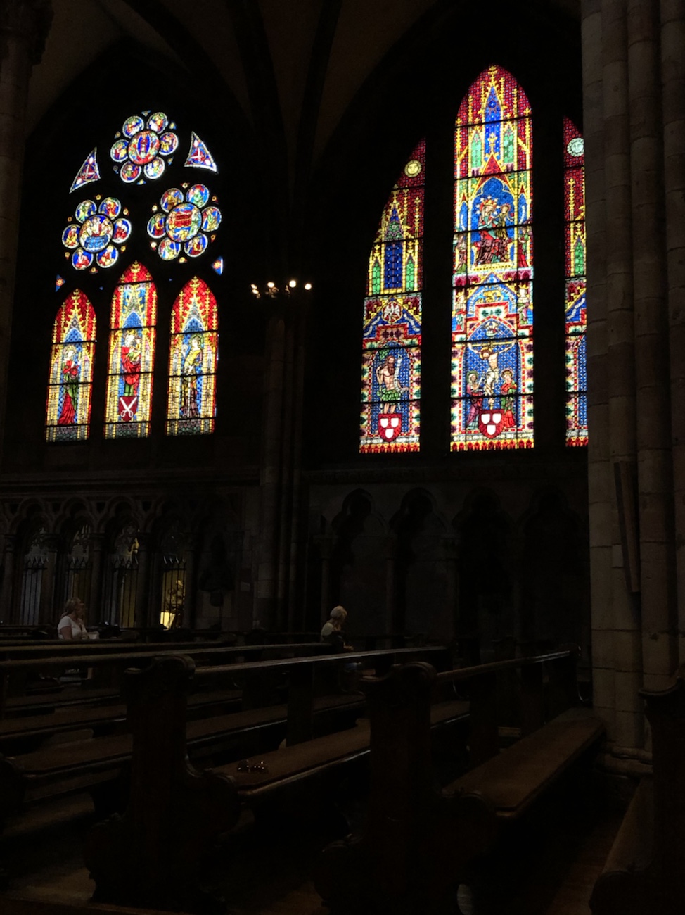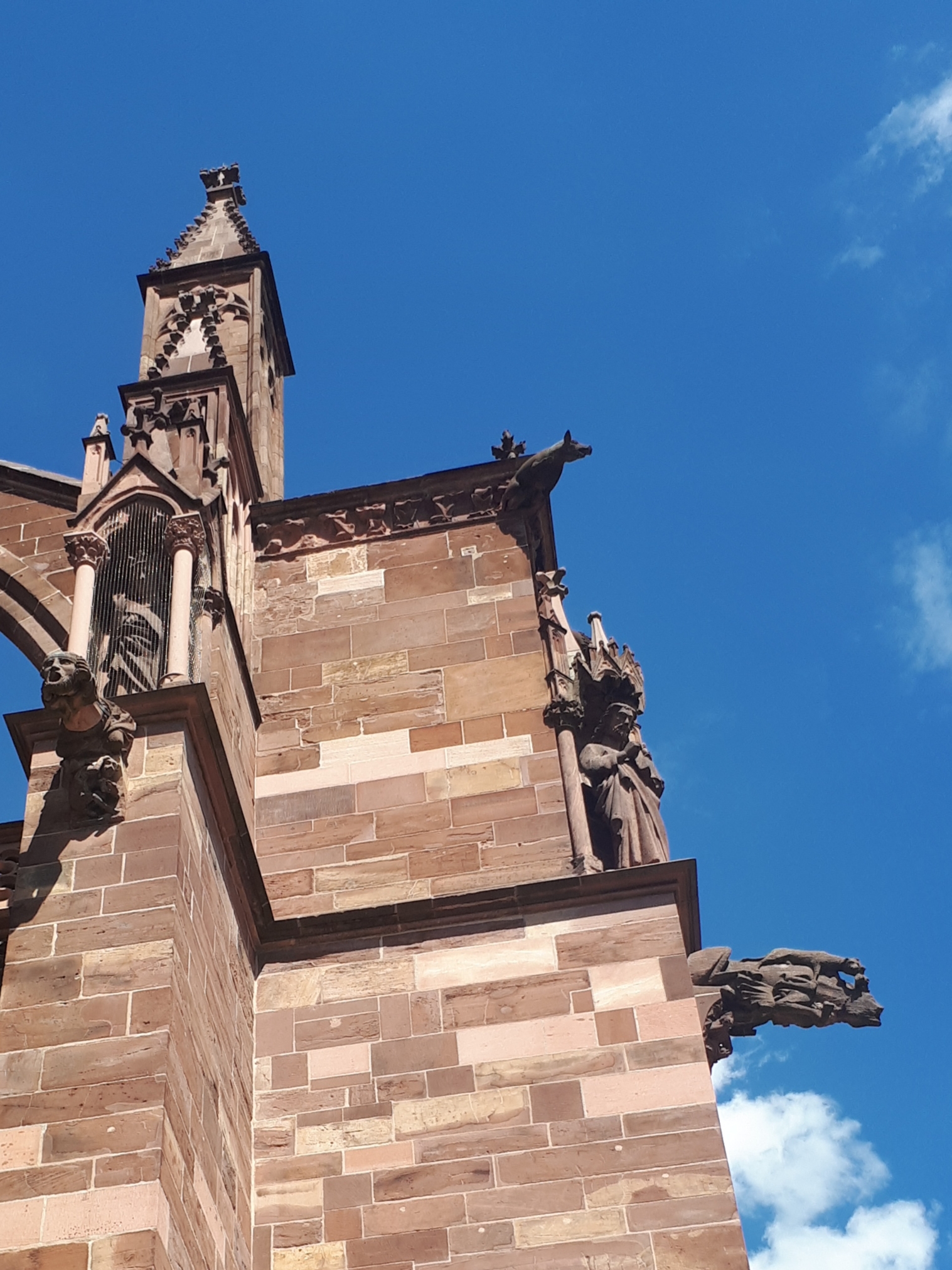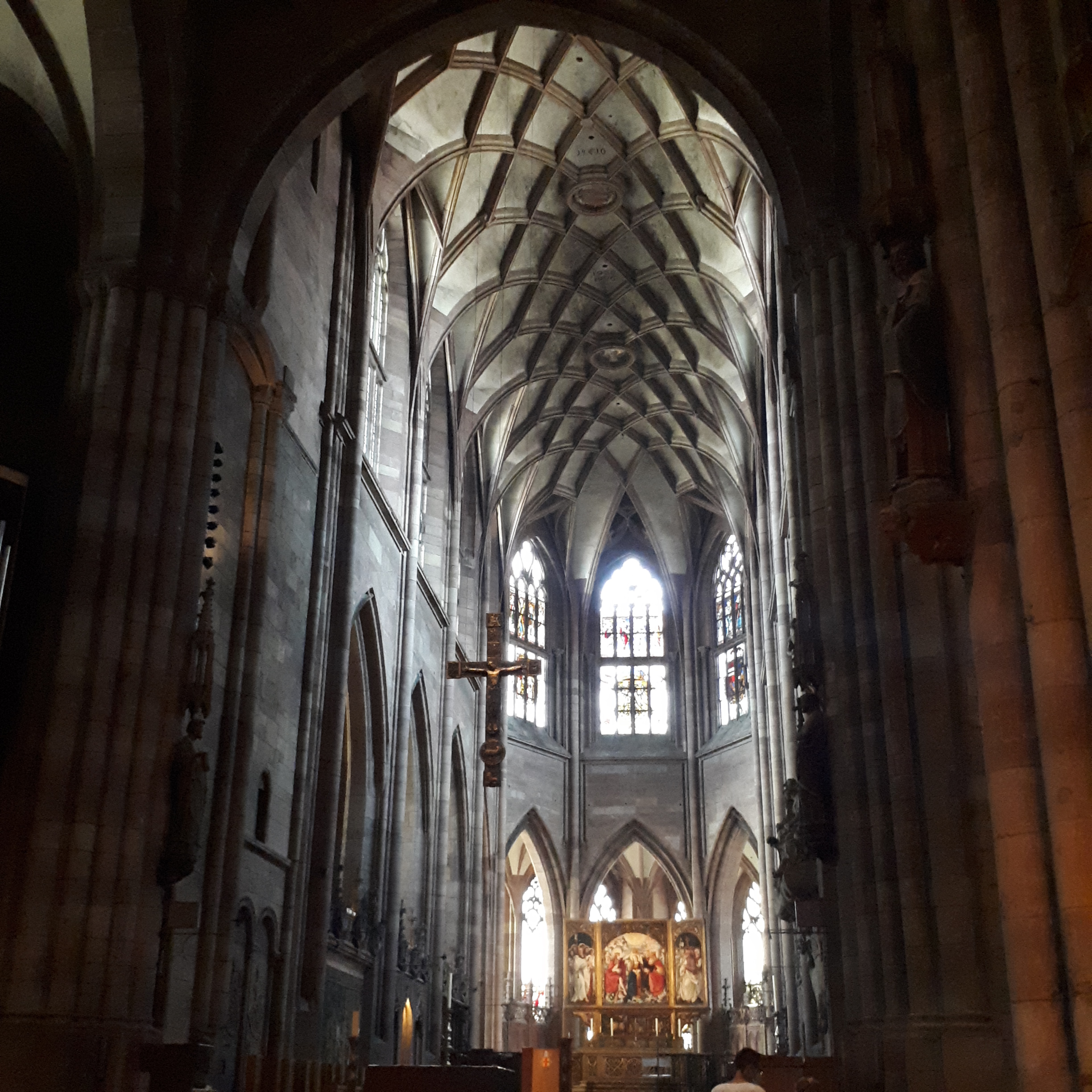 Das Freiburger Münster ist groß und innen ungewöhnlich dunkel für eine Kirche, was in erster Linie durch die roten Steine und die mit Buntglas (teilweise jedoch in recht dunklen Farben) bestückten Fenster unterstützt wird. Das Münster ist, wie es in der Regel wohl bei allen Kirchen der Fall ist, in Ost-West-Richtung ausgerichtet. Dies hatten wir bei unserer Führung in St. Marien in Lübeck gehört, was uns aber bis dahin nicht bewusst war (und wofür es natürlich auch eine Begründung gibt).