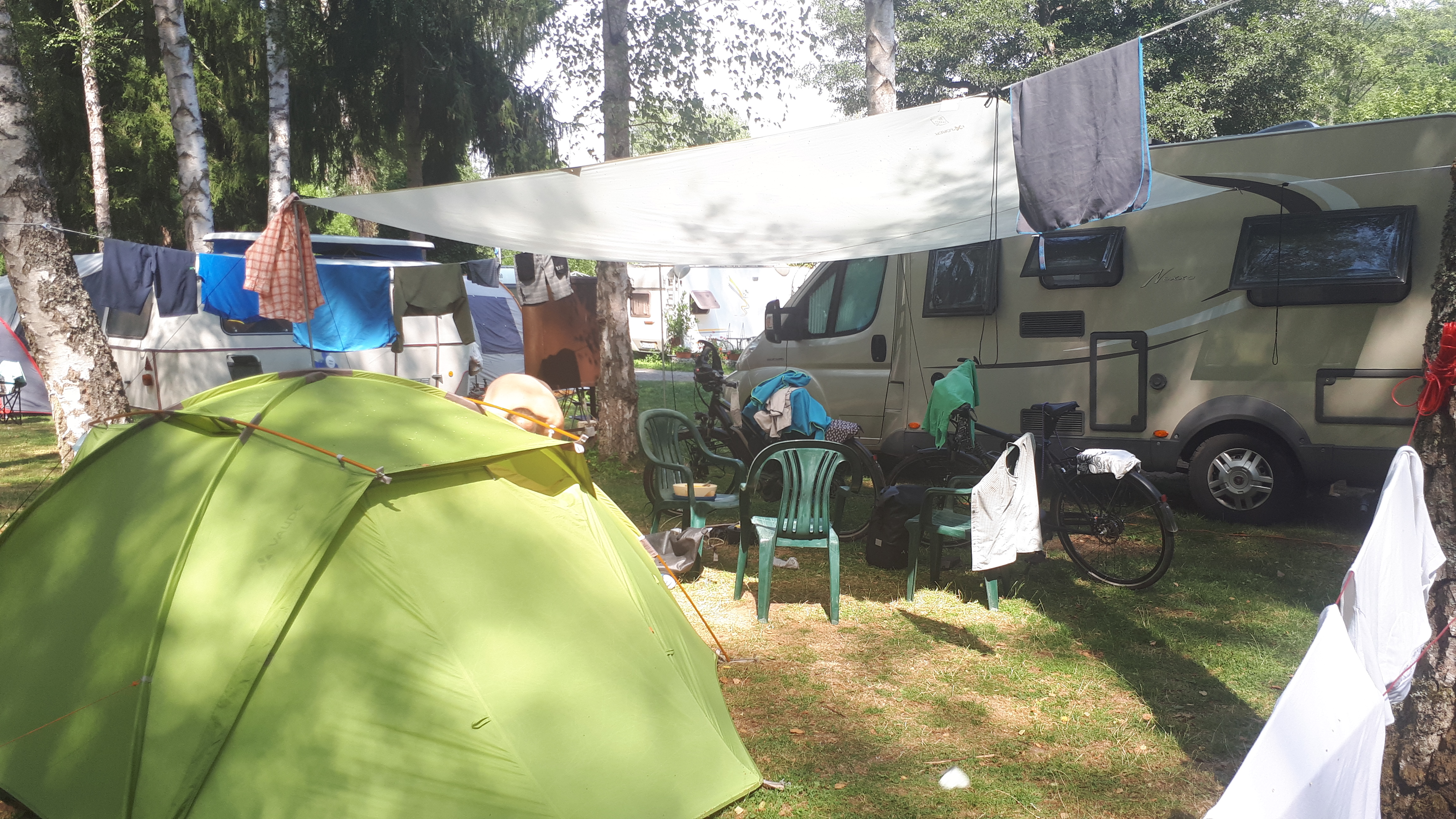 (AR) Nun sind wir seit Samstagabend hier auf dem Campingplatz an der Tauber und heute ist schon Mittwoch – und auch heute werden wir unseren schönen Platz hier noch nicht verlassen. Es sind immer noch über 30°C und spätestens ab mittags gleicht der Luftzug auf dem Rad einem auf Hitze-Stufe 2 gestellten Fön. Stattdessen genießen wie die Ruhe, haben netten Platznachbarn um uns rum, die auch ein paar Tage länger hier bleiben, und die Tauber, sehr geeignet für eine willkommene Abkühlung, ist nur 20 m entfernt von unserem Zelt. Viel besser geht es nicht! Man kann zu jeder Tageszeit rings ums Zelt je nach Wunsch einen Sonnen- bzw. bei den aktuellen Temperaturen doch eher einen Schattenplatz wählen. Wenn es zu warm wird, gehen wir zur Einstiegstelle an der Tauber und kühlen uns ab. Abkühlen im wahrsten Sinne des Wortes! Die Tauber ist echt frisch – wenn man drin ist, ist es auch gut, aber selbst ich, die doch eher mal ins kühle Nass geht, brauche immer einen Moment bis ich komplett eingetaucht bin – aber wir haben doch auch das Gefühl, man gewöhnt sich etwas daran. In dem Zusammenhang staune ich ja wirklich über Jörg, der von sich selbst sagt, er sei ein Warmduscher. Er geht in die Tauber – auch wenn es noch einen Moment länger dauert als bei mir und er meist auch schneller wieder raus ist. Es kommt sogar vor, dass er selbst eine Abkühlung vorschlägt – und das heißt schon was 😉 ! Wenn man hinterher wieder raus ist, ist man wirklich herrlich erfrischt und hält es wieder gut eine Weile bei den Temperaturen aus! Allerdings kommt immer wieder die Frage hoch, warum die Tauber eigentlich so kalt ist, da sie weder eine hohe Fließgeschwindigkeit hat noch besonders breit ist. Sie ist hier jedoch mit 4 – 6 m Tiefe quasi genauso tief wie breit und auf einer großen Länge oft durch die Bäume beschattet, was vermutlich eher die Gründe sein werden, weshalb sie sich nicht so aufwärmt, wie beispielsweise der viel breitere Main.