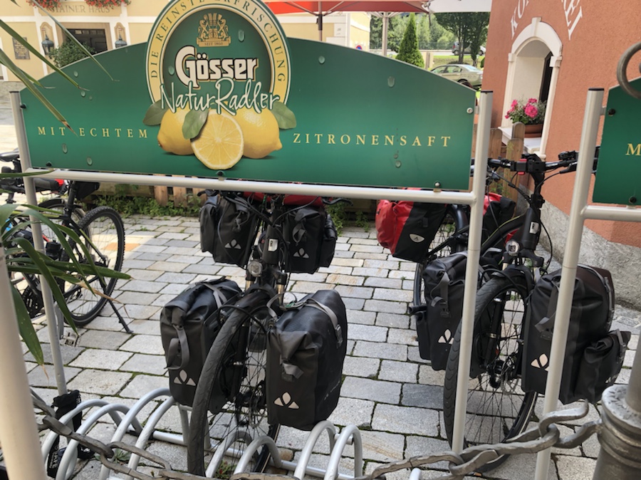 Lienz hatte uns ja schon beim ersten Besuch gut gefallen, aber der nun folgende zweite Besuch hatte auch leider einen notwendigen Grund: eine (und wie wir im Nachhinein erschreckt feststellen müssen DREI) der nagelneuen Vaude-Radtaschen sind an der werkseitig geklebten Naht aufgegangen! Und das nach nicht mal einer Woche in Benutzung! 🥴 Da sich ein Kleben der kaputten Stelle mit Panzerklebeband bereits im vergangenen Jahr nicht als dauerhaft erwiesen hat, beschlossen wir uns mal wieder nach neuen Taschen umzusehen. Wie ärgerlich, zumal eine Reklamation bei Vaude zwar grundsätzlich neue Taschen bescheren wird, aber das nutzt wenig, wenn der Kassenzettel in Duisburg oder Berlin liegt… Also klapperten wir in Lienz zwei Sportgeschäfte ab und entschieden uns dieses Mal für Taschen des anderen großen Radtaschenherstellers Ortlieb. Die kaputten bzw. ‚alten’ Taschen werden wir auch weiter auf den Rädern mitnehmen, um sie dann wiederum bei Vaude zu beanstanden.