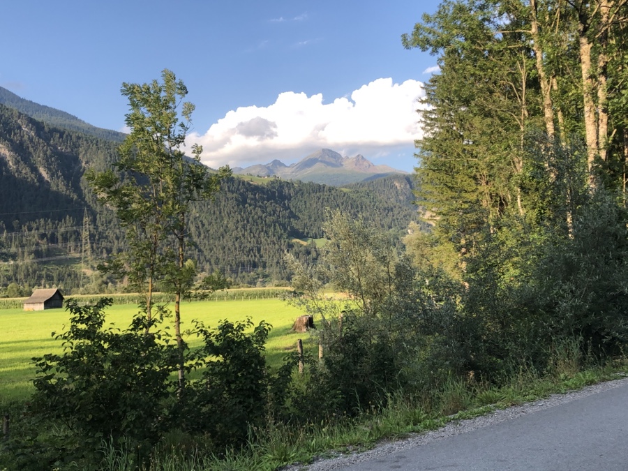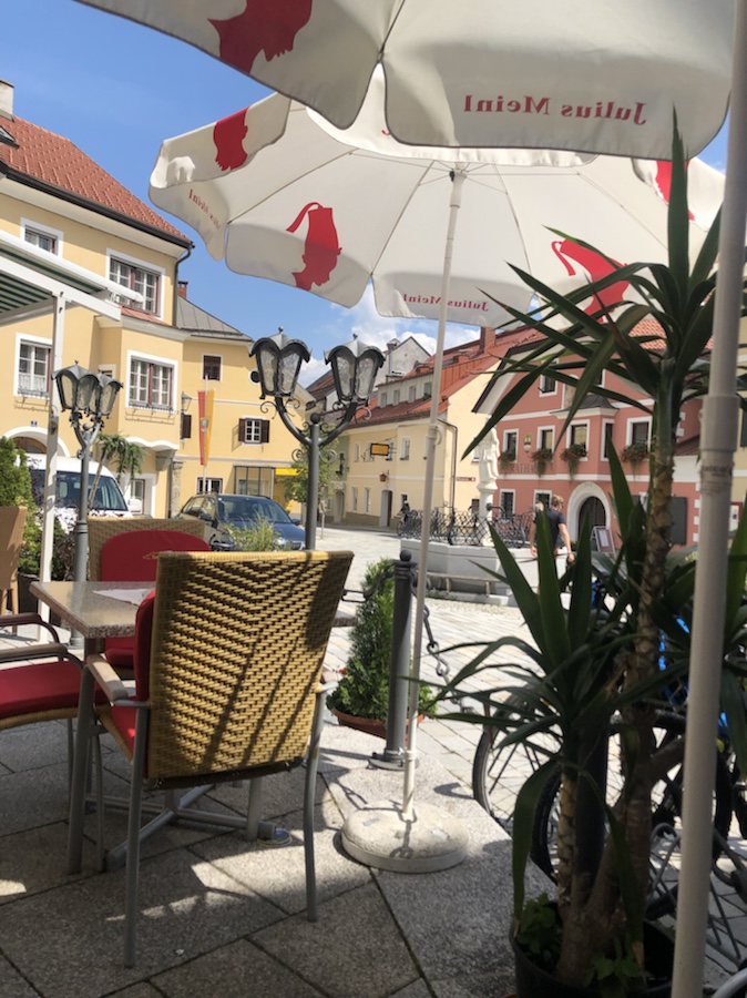 Als wir Appetit verspürten war natürlich kilometerlang keine der vormals reichlich zu sehenden Radlerkneipen oder auch Buschenschenken wie man hier oft sagt, anzutreffen…. was tun?! Vielleicht erinnert ihr euch noch wie das mit dem ‚hungrigen Mann‘ im letzten Jahr war?! Zum Glück gab es dann aber kurze Zeit später am Wegesrand einen kleinen „Selbstbedienungshofladen“ auf einem Bauernhof und direkt daneben eine passende Sitzgelegenheit im Schatten! Was fehlte war ein gekühltes Radler oder irgendetwas trinkbares in für uns sinnvoller Größe (was sich bei einem kurzen Gespräch mit der Bäuerin wohl durch steuerliche und gewerberechtliche Gründe erklären lässt), denn Reste von einem zu kaufenden fünf Liter-Tetra Pak Apfelsaft wollten wir uns nicht aufs Rad binden. Aber das am Morgen übrig geblieben Croissant fand mit neu erworbenen Hauswürsteln, einem ‚normalen’ Naturjoghurt, einem Mangojoghurt aus Schafsmilch und zum Abschluss noch einem sehr leckeren Marilleneis in uns dankbare Abnehmer. Was für eine leckere Mahlzeit und danach ließen sich die übrigen Kilometer bis nach Spittal noch gut überbrücken.