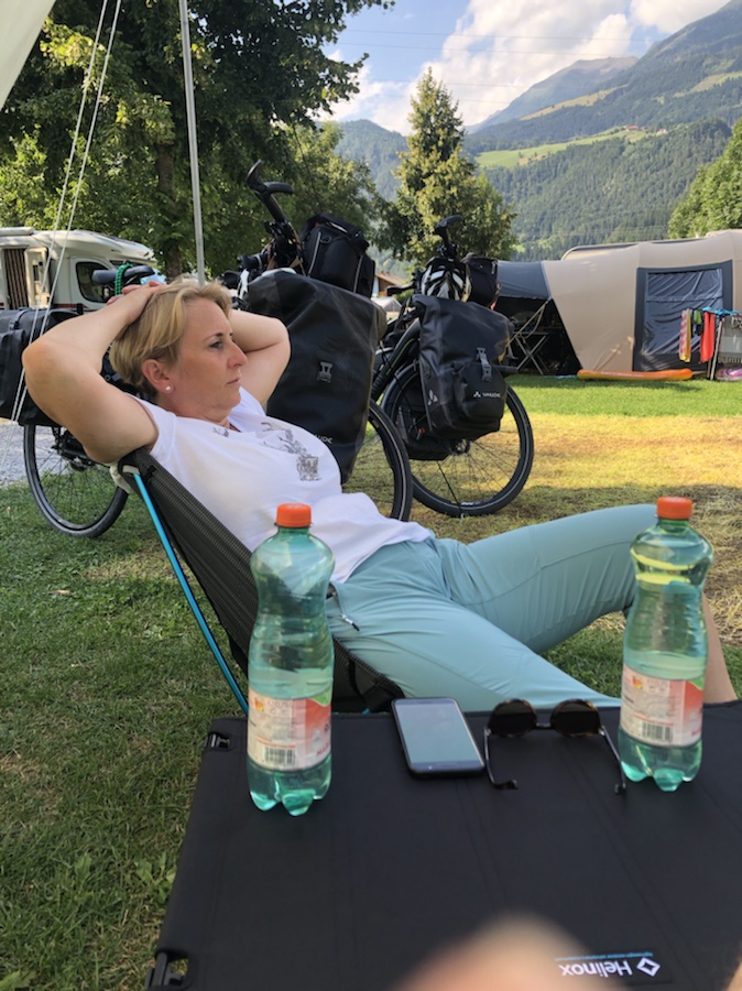 Abends auf dem Campingplatz unterhielten wir uns mit einem anderen Radler, der auch den Eindruck hat, dass – seitdem Vaude auf ein vermeintlich ökologischeres Material umgestellt hat – die Taschen nicht mehr so langlebig sind. Unsere allerersten Taschen haben uns acht Jahre begleitet und alle Nähte halten prima, nur an der ein oder anderen Stelle an der Standfläche ist das Material mittlerweile dünn und zwei drei kleine Löcher haben wir mit entsprechenden Reparaturaufklebern repariert – dauerhaft. Wodurch sich die Frage stellt, was ist wirklich ökologischer und vor allem nachhaltiger – wir plädieren für die alte, stabile und ‚unkaputtbare‘ Machart!