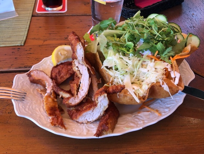 Mittlerweile schon fast in Villach angekommen, haben wir Hunger und entschließen uns aufgrund der Zeit (natürlich macht sich der Hunger erst nach den mittäglichen Öffnungszeiten von Restaurantküchen bemerkbar) die Stadt auf dem kürzesten Weg zu durchqueren und bis Wernberg zu fahren. Unser Lieblingsgasthaus Fruhmann hat durchgehend warme Küche und ist seit je her immer eine gute Wahl, was alle meine Kinder bestätigen können. Wir genießen jeder unser Salatkörbchen mit Putenschnitzel nach Wiener Art und während wir uns wundern, wie trotz strahlendem Sonnenschein um uns herum die kleine Regenwolke sich durchkämpfen und immer größer werden, um uns etwas Abkühlung zu verschaffen.
