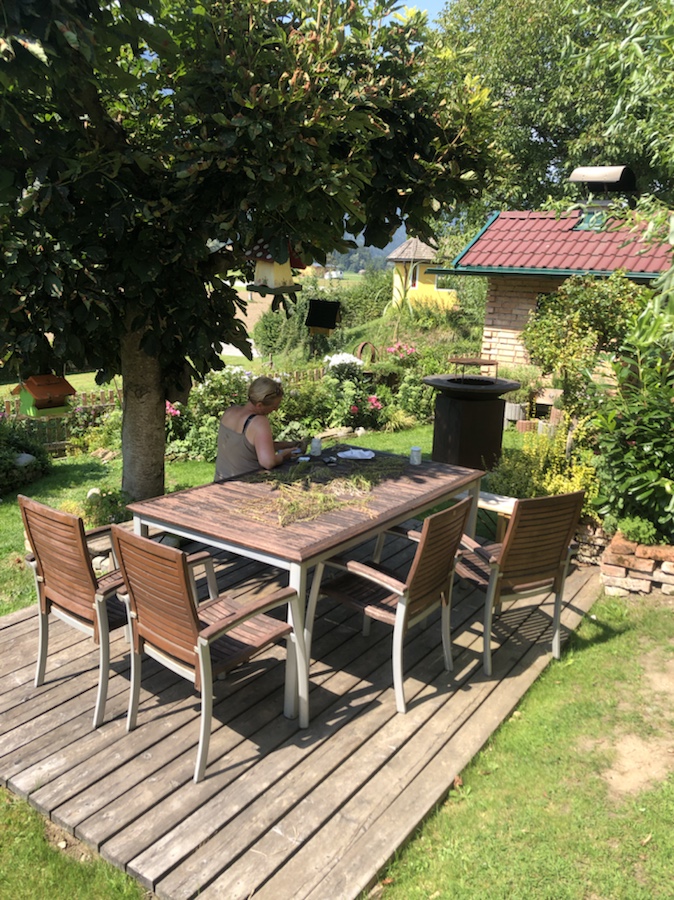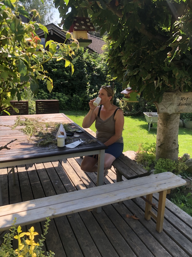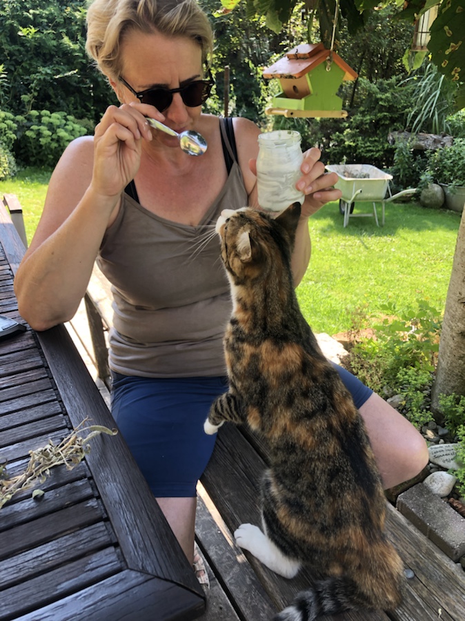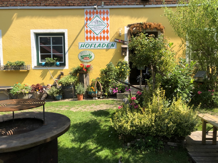 Notbremsung, umdrehen, einkehren und sich wohlfühlen… Wir waren noch nicht weit von Spittal weg, da wären wir doch fast an diesem Idyll vorbeigefahren. So stellt man sich einen Hofladen vor – viele Leckereien in einem Umfeld welches perfekt in jeden ländlichen Heimatfilm passen würde. Wir kauften Joghurt und Nussschnecken, alles andere was Begehlichkeiten weckte, musste leider aus Platzmangel am Rad in den Regalen stehenbleiben. Unsere Einkäufe konnten wir uns am Tisch in dem angrenzenden netten Bauerngarten schmecken lassen und die Hofkatze genoss sowohl die Joghurtreste, als auch die ihr von Anja dargebrachten Streichel- und Krauleinheiten. Ich bin ja etwas vorsichtig bei fremden Tieren, gerade dann, wenn diese Krallen, Zähne oder Hörner haben. Fische find ich toll, aber mittlerweile auch eher im Ganzen gebraten auf dem Teller. 😇