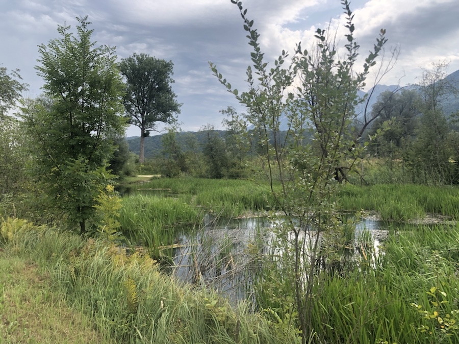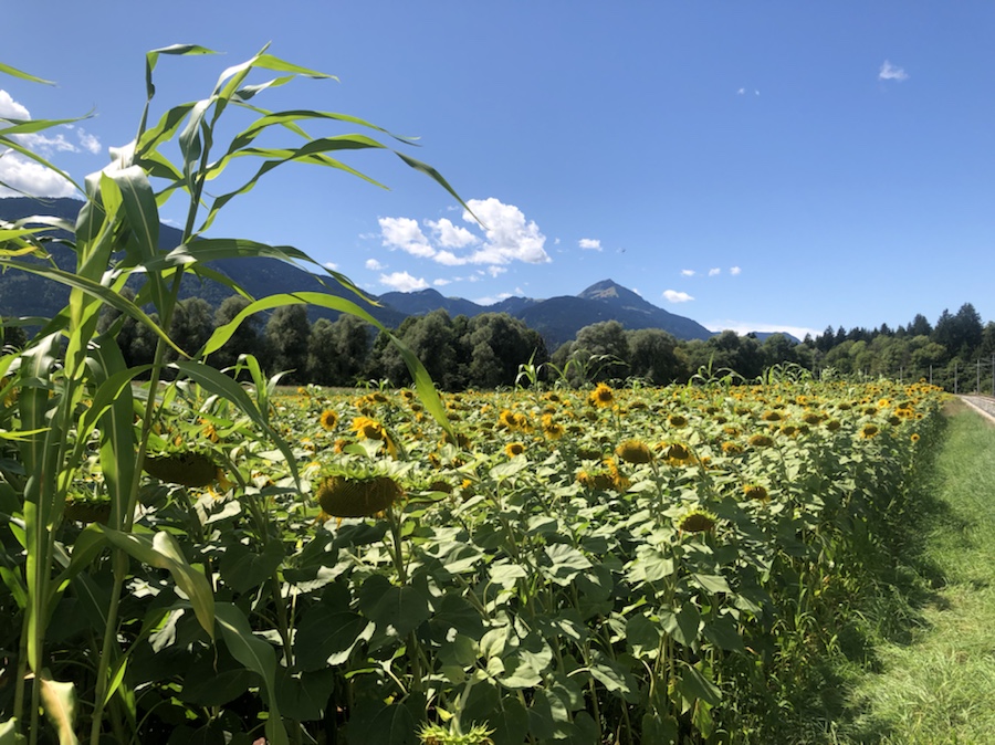 Am nächsten Morgen war es deutlich kühler, aber es war trocken und die Sonne setze sich gegen die Wolken durch. Nun ging es aber doch noch einmal den Berg hinunter zur Drau, da wir nicht so viel an der Straße und durch Villach fahren wollten. Noch vor dem Stadtzentrum kamen wir an den Punkt, wo die Gail in die Drau fließt und bogen dort auf den Gailtal-Radweg ab. Es war eine schöne Strecke am Fluss entlang. Irgendwann ging es auch etwas weiter von der Gail weg und ein paar Höhenmeter rauf. Dann kamen Gitterroste und kurze Zeit später fanden wir uns an einer kleinen Alm wieder. Ein paar Kühe, Ziegen und eine Unmenge von Rädern – alle wollten eine kleine Stärkung bei Lissy’s Alm! Es war auch wirklich die einzige weit und breit! Mit einem Brot gestärkt ging’s weiter durchs Bärengebiet – aber wir sind zum Glück dann doch keinem in freier Wildbahn begegnet! Wir radelten Kilometer um Kilometer und genossen den Blick aufs Tal und die Berge – es war herrlich anzusehen und die Temperaturen waren super um eine längere Strecke zu fahren.