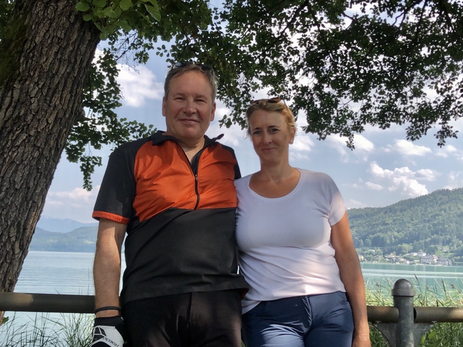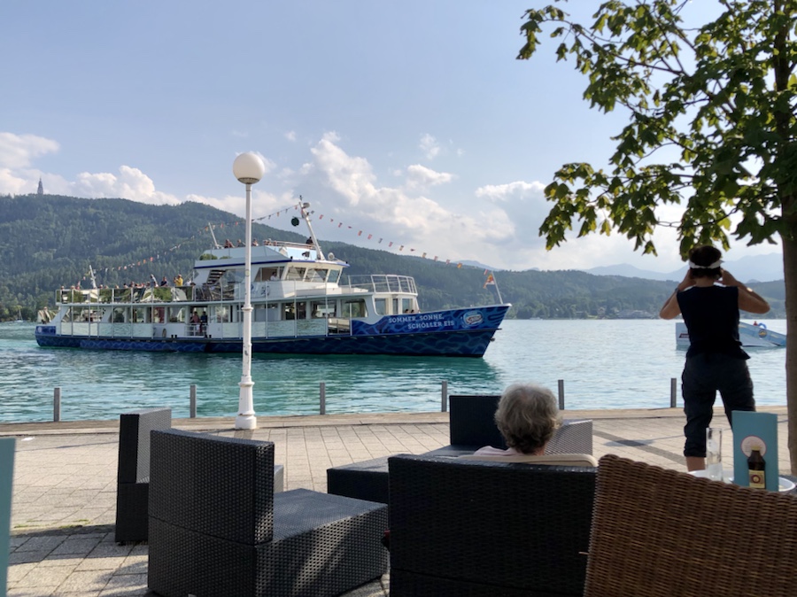 Dann ging es weiter zur bereits bekannten Innenstadt von Klagenfurt, denn inzwischen meldeten sich unsere Mägen – aber wie üblich etwas nach der gängigen Mittagszeit. Als Großstädter kann man es ja sowieso nicht verstehen, dass es Orte gibt, wo nicht jederzeit eine warme Mahlzeit zu bekommen ist. Aber wie man nach den langen Schließzeiten aufgrund der Pandemie einen Betrieb, bei dem wir neulich noch hervorragend gegessen hatten, in Betriebsferien zur Hochsaison schicken kann, ist uns nicht verständlich. Aber gut, das Wetter klarte auf und wir fuhren raus zum Wörthersee. Wir wollten es wagten, die neulich begonnene Strecke am See fortzusetzen (die wir ja aufgrund der abgefahrenen Bremsen abgebrochen hatten). Zuvor gab es jedoch am See eine kleine Pizzeria, die durchgehend warme Küche hatte, und so ließen wir uns beide noch einen Teller Pasta schmecken. Frisch gestärkt ging es dann über Pörtschach und Velden bis zu unserem Tagesziel Wernberg – dort hatten wir in derselben kleinen Frühstückspension wie vor ein paar Tage, ein Zimmer ergattert. Rund um den Wörthersee waren nur Zimmer zu Preisen zu bekommen, die wir nicht gewillt waren zu zahlen – und da sprechen wir von hohen dreistelligen und vierstelligen Preisen pro Nacht!!