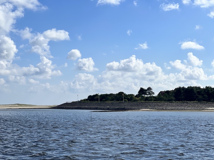 Die Fahrt nach Dagebühl zieht sich mal wieder – und ja, wir haben ewig Gegenwind. Mal wieder richtig. Und wir haben Zeitdruck, wollen wir doch die Fähre um 14:30 Uhr bekommen. Es gibt auch noch eine spätere, aber dann wird es auf dem Zeltplatz so spät. Also strampeln gegen den Wind… Jörg fällt es heute aus nicht erklärlichen Gründen besonders schwer, irgendwie ist die Luft raus. Da hilft auch ein E-Bike wenig, wenn man nicht abschätzen kann, wieviel man bis zur Fähre an Akkuladung verbraucht und daher vorsichtshalber nur die minimal möglichste Unterstützung nutzt. Denn je höher die Unterstützung desto schneller ist natürlich auch der Akku leer. Also hart gegen den Wind! Inzwischen sind wir aber auch soweit, dass wir nicht auf Leben und Tod die angedachte Fähre nehmen wollen. Gegebenenfalls rufen wir beim Campingplatz an und geben Bescheid, dass es bei uns später wird. Rund 6 km vor dem Fähranleger treffen wir eine Familie mit zwei kleinen Mädchen (ca. 5 und 8 Jahre alt). Alle ohne E-Bikes, die wohl auch schon 10 km unterwegs sind und auch besagte Fähre bekommen wollen. Wir sollen doch bitte die Fähre ‚einfach etwas aufhalten‘. Gesagt, getan. Wie durch ein Wunder sind wir 10 Minuten vor Abfahrt an der Fähre – eigentlich reichlich Zeit denkt man. Beim Fahrscheinkauf – keiner stand vor uns – bekommen wir dann aber die Ansage, ob wir nicht wüssten, dass Radfahrer mindestens 15 Minuten vor Abfahrt da sein sollen! Schon, aber der Gegenwind… Egal, wir dürfen mit den Rädern an Bord rollen! Geschafft!! Und die Familie mit den Kindern?!? Die Fähre muss auf Passagiere aus einem Zug der Deutschen Bahn warten und wie bekannt, ist fast immer Verlass auf deren Verspätung 😀 – so auch in diesem Fall und so fährt auch diese Familie noch gemeinsam mit uns nach Amrum!