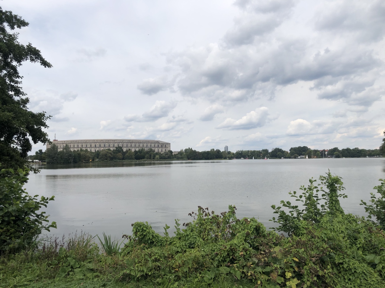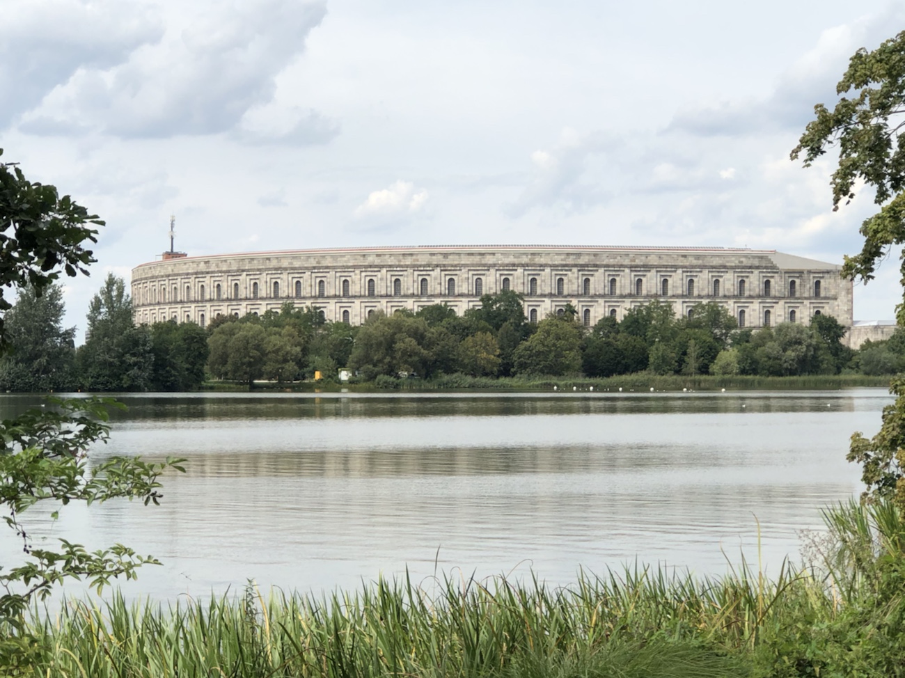 Wie schon geschrieben, liegt das Gelände etwas außerhalb von Nürnberg, wo es vor der Errichtung der Bauten als Naherholungsgebiet diente. Wir sind auf Anraten unseres Stadtführers vom Vortag mit dem Rad hingefahren und haben erst gar nicht in Betracht gezogen die Ausstellung im Dokumentationszentrum anzusehen. Wir wollten ‚nur‘ das Gelände an sich besichtigen, wo allerdings auch überall Schau- und Informationstafeln zu den einzelnen Bauten zur Verfügung standen. Schon bei der Besichtigung der Burgen hatten wir von Weitem einen Blick auf die Kongresshalle werfen können, die trotz der ca. 5 km Luftlinie gut zu erkennen war. Aber jetzt, wo wir direkt davorstanden, wirkte dieses Projekt in seinem ganzen Größenwahn noch einschüchternder. Und als wir dann das Gebäude umfahren hatten und den dahinter liegenden Innenhof dieser Halle sahen – einfach nur beeindruckend. Fünfzigtausend Menschen sollten hier Platz finden, 70 Meter hoch sollten die Mauern werden und ein freitragendes Dach war geplant. Verwirklicht wurden nur neununddreißig Meter hohe Mauern und das Dach wurde nie gebaut, aber man kann trotzdem erahnen, wie selbst dieser unfertige Prunkbau zu damaliger Zeit auf die Menschen gewirkt haben muss.