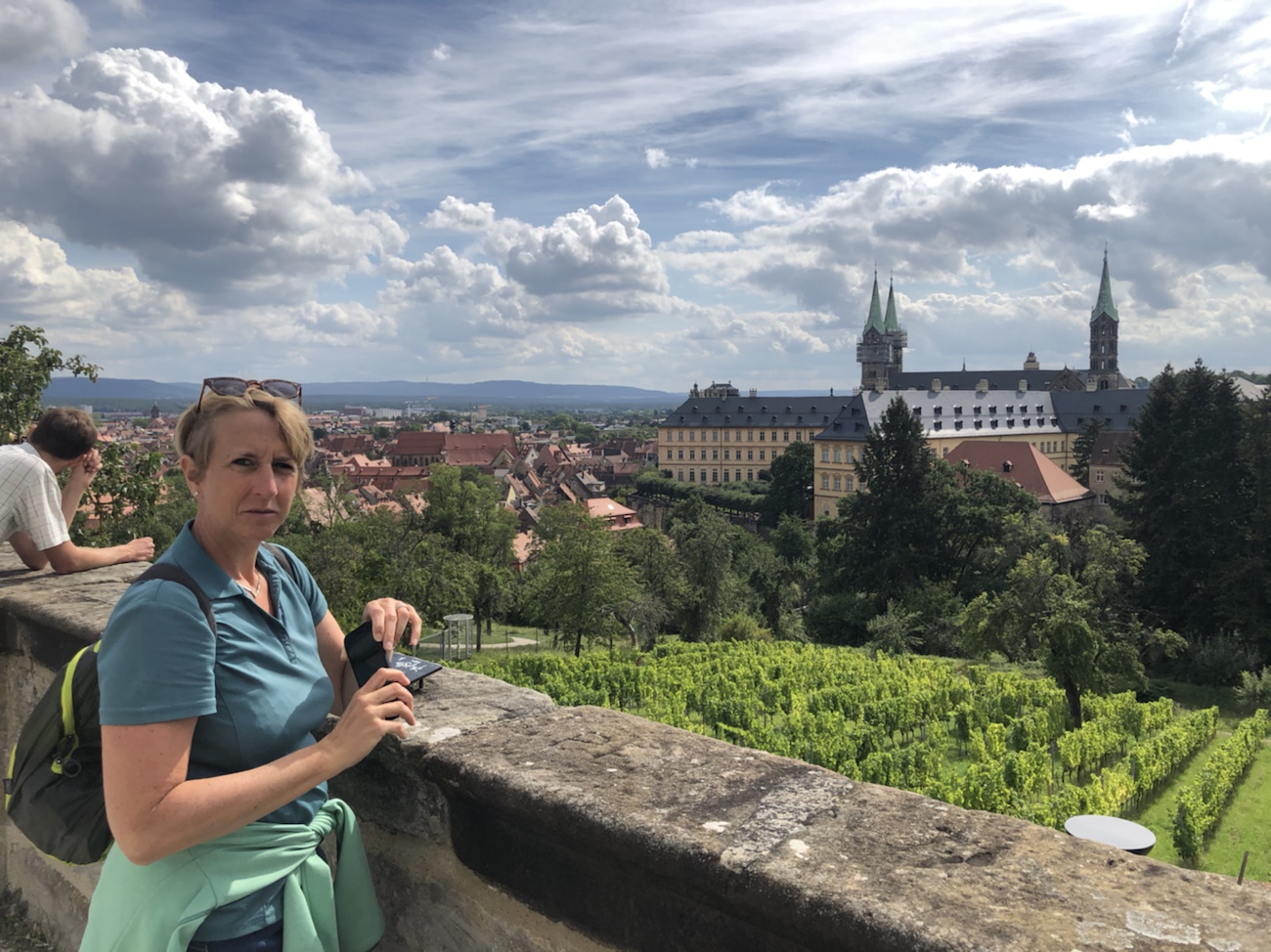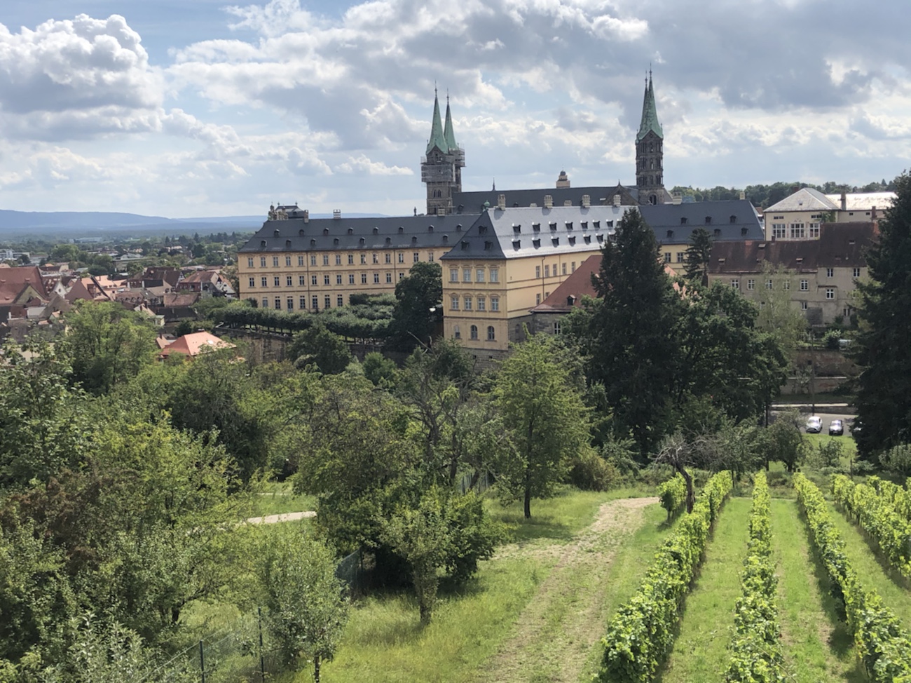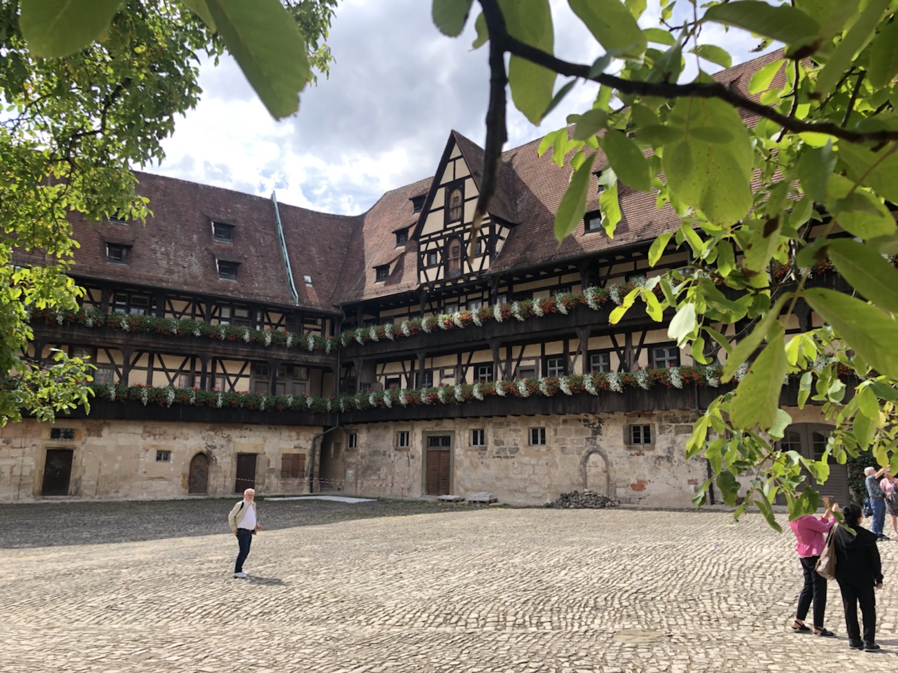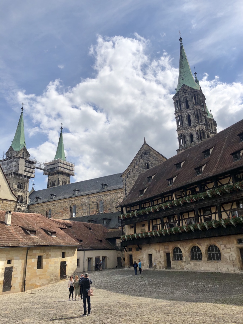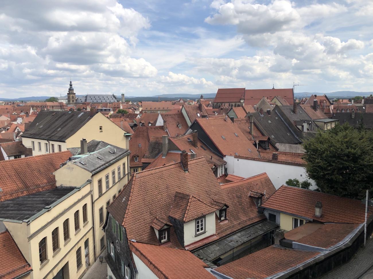 Bamberg hat ja im Grunde drei Bereiche: die Bergstadt mit Dom, Residenz und Kloster, die Inselstadt mit seinen vielen Läden und Restaurants sowie die Gartenstadt, wo auch heute noch Gemüse und Samen angebaut bzw. verkauft werden. Die Stadtteile gehen relativ unbemerkt von einem Bereich in den anderen über und sind dennoch sehr unterschiedlich – und das Wasser ist allgegenwärtig als rechter und linker Arm der Regnitz sowie als Main-Donau-Kanal. Wir begannen unseren Fußmarsch in, oder besser zur Bergstadt und bekamen so gleich zu Anfang einen schönen Ausblick über diese noch heute etwas mittelalterlich anmutende Stadt! Wir hatten eine tolle Weitsicht und insbesondere auch über die teilweise arg krummen und schiefen Dächer der Stadt! Es sind wirklich tolle und imposante mittelalterliche Bauten, die später äußerlich in Barock ‚umgewandelt‘ wurden, um zu zeigen, dass man (stein)reich war und (vermeintlich) mit Stein bauen konnte. Das hatten wir mittlerweile gelernt – viel Stein, viel Reichtum. Nein, jetzt bitte nicht denken, dass dafür die schönen Fachwerkhäuser platt gemacht und neue Steinhäuser gebaut wurden. Es wurden ’nur‘ die Fachwerkwände überputzt und man bekam Steuererleichterungen, wenn man zusätzlich möglichst viele Fenster eingebaut hat. Ganz ehrlich, dass erinnert mich irgendwie an heutige KfW-Kredite u.ä. für energetische Sanierungen. Wenn man damals ergänzend noch eine heilige Figur (wobei manche den Begriff ‚heilig’ sehr frei auslegten) an die Fassade anbringen ließ, wurden nochmal weniger Steuern fällig… Die Stadtoberen fanden also auch damals schon Wege und Mittel die Stadt nach ihrem Gusto umzugestalten, so dass es Reichtum und Macht darstellte sowie auch Vorteile beim Handeln ergab.