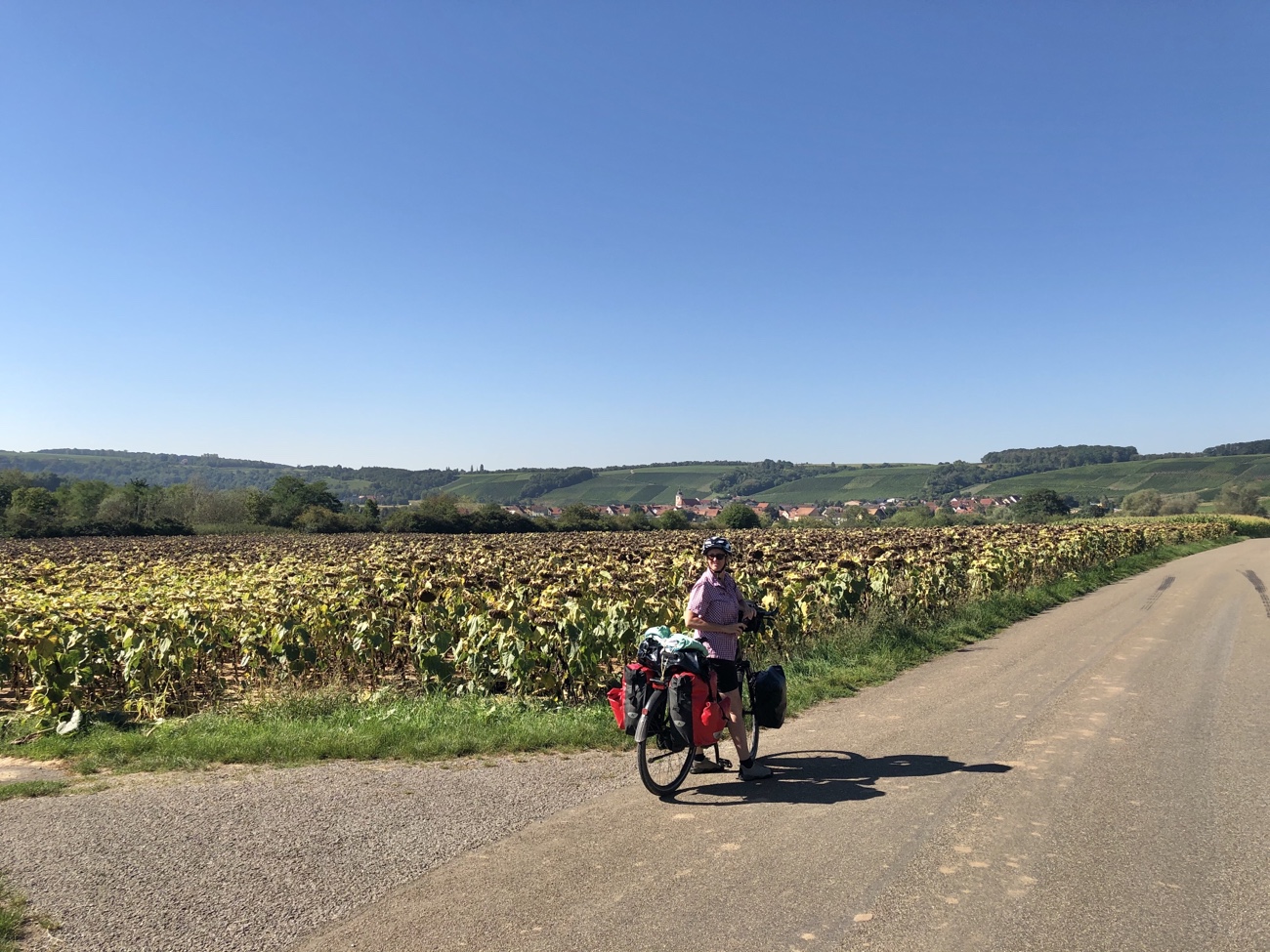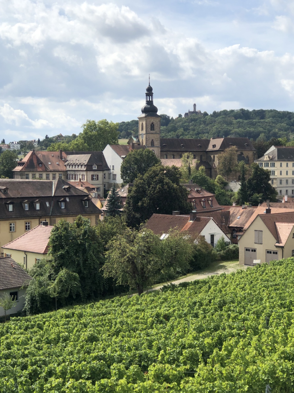 Genug der Sentimentalitäten… Wir radelten bei strahlend blauem Himmel und Temperaturen von 25°C quer durch den Steigerwald dem Main entgegen. Weinreben bestimmten auf einmal wieder die Landschaft und zwischendurch Maisfelder und große Felder mit mittlerweile völlig eingetrockneten Sonnenblumen. Ringsum sahen wir immer wieder große Erntemaschinen, die in kürzester Zeit aus einem Maisfeld einen kahlen Acker machen und unzählige Trecker mit Anhängern, die die gesamten gehäckselten Pflanzen zu riesigen Mieten aufschütten woraus im Winter, mittlerweile vergoren und als Silage bezeichnet, das Viehfutter entnommen wird. Zu Beginn unserer Tour waren die Maispflanzen oft noch relativ klein, jetzt sehen wir zu wie geerntet wird. Ebenso ist es beim Wein, denn wo vor zweieinhalb Monaten nur die Ansätze der Trauben oder die noch relativ kleinen Beeren an den Weinstöcken sichtbar waren, hängen heute deutlich sichtbar rote oder grüne Trauben, teilweise erntereif, teilweise doch noch recht sauer. Aber es werden immer mehr Weinberge, in denen man das geschäftige Treiben der Ernte sieht. Und auf fast jedem Wochenmarkt gibt es schon den ersten Federweißen und Zwiebelkuchen – bekanntlich beides durchaus ‚durchschlagend‘ was die Darmtätigkeit anbelangt. Da hast du nicht nur beim Essen und Trinken was von 😏. Vorsichtshalber haben wir bisher Abstand genommen von dieser Versuchung – man muss ja nichts herausfordern.