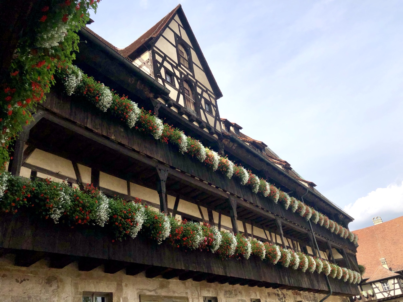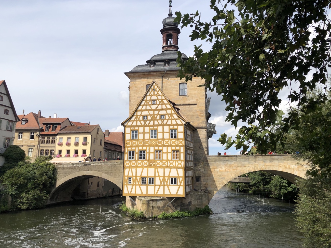 Bei so viel Wasser in der Stadt mit verschiedenen Flussarmen gibt es auch bei den Bambergern einen Bereich, der ‚Kleinvenedig‘ genannt wird. Wir hatten so etwas wie ein mit Kanälen durchzogenes Areal mit Häusern, so wie in der Nähe vom Stößensee in Spandau erwartet, wo Jörg und ich mal mit Kanus durchgepaddelt sind. Aber hier war es ‚nur‘ eine Reihe von Fachwerkhäusern, ehemalige Fischerhäuser, die am Wasser stehen und vom anderen Flussufer bestaunt werden können. Na ja, trotzdem ein schöner Hingucker und ein beliebtes Fotomotiv, vor allem wenn so toll die Sonne scheint wie bei uns. Heute kann man zum Teil auch Ferienwohnungen darin mieten – und die sind sicher gar nicht mal so preiswert. 😏