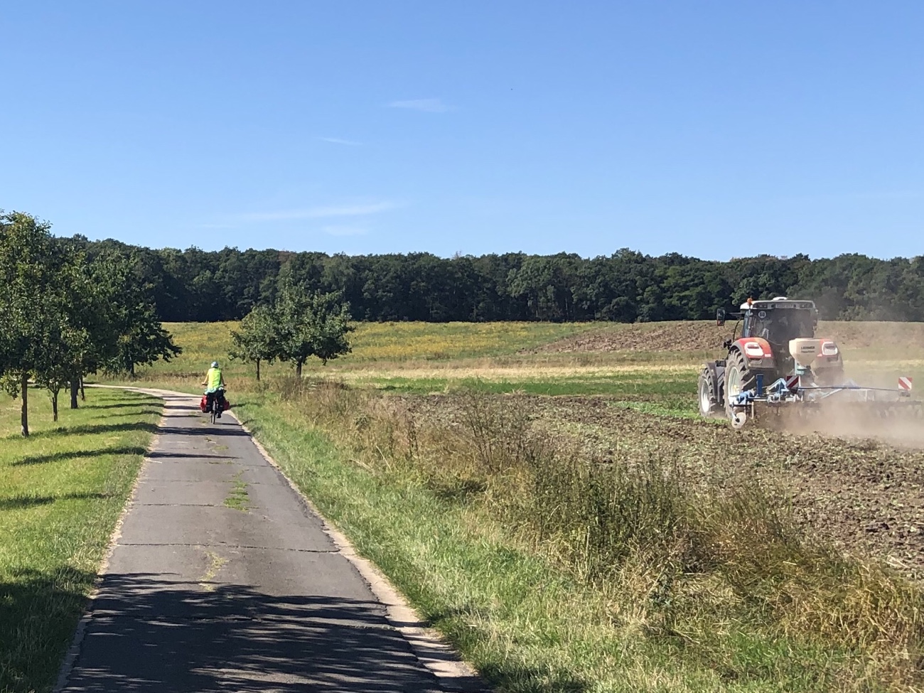(Ju) Einerseits sind wir gefühlt schon eine Ewigkeit unterwegs, andererseits gibt es immer wieder neue Eindrücke und wir stehen vor Situationen, die wir bisher nicht erlebt haben, was uns das Gefühl gibt immer noch am Anfang der Tour zu stehen. Noch heute Morgen haben wir breit grinsend auf dem Rad gesessen, als wir mitten durch den Steigerwald fuhren und uns immer noch an den schönen Blumen und Pflanzen, an dem ein oder anderen über und über mit Früchten beladenen Obstbaum und dem sich wieder deutlich ändernden Landschaftsbild erfreuen konnten.