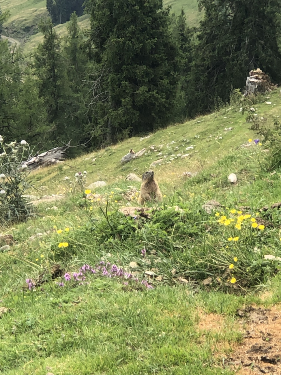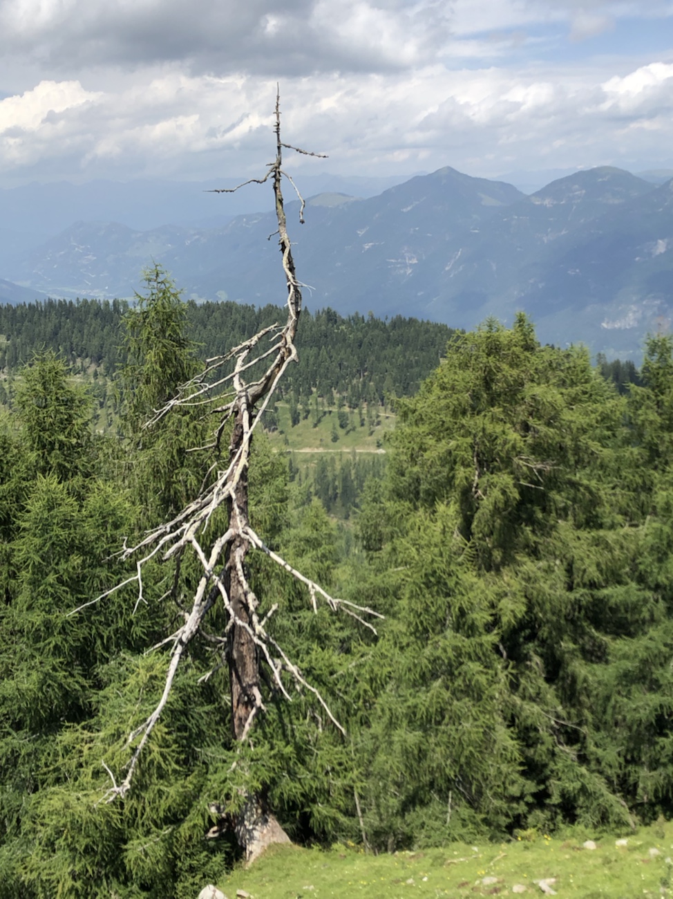 Da wir jetzt ja mit dem Auto UND den Rädern unterwegs sind, lerne ich die Umgebung nochmal ganz anders kennen. Wir fahren über Wege, die früher zu Fuss nicht meine waren. Mit dem Auto hoch zur Eggeralm, da das Auto abgestellt und die ca. 4 km zur Dellacheralm mit dem Rad vorbei an Rindern und Pferden, die sich dort frei bewegen. Einige Kilometer den Berg weiter rauf, da gibt es noch eine Alm und den Gipfel des Poludnig. Anja wollte zuerst lieber laufen anstelle ständig bergauf zu strampeln (immerhin eine Stecke von 12,5 km), aber wir haben es dann doch mit dem Rad probiert – und geschafft, auch wenn uns trotz Motor zwischenzeitlich die Puste fast ausgegangen ist. Belohnt wurde der Einsatz mit einer leckeren Bretteljause und auf der anschließenden Abfahrt mit dem Zusammentreffen mit unseren ersten freilaufenden Murmeltieren, die uns aufrecht auf dem Po sitzend beobachteten und, wenn wir zu nah herankamen, blitzartig in ihren gegrabenen Gängen verschwanden. Sowas zu sehen ist schon ein Glücksgefühl.