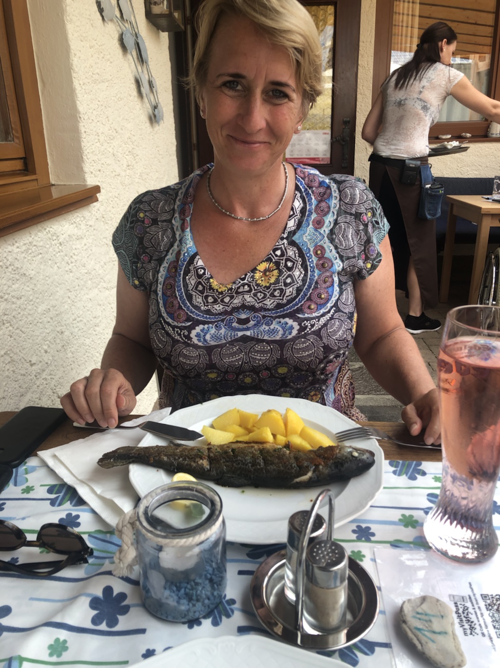 Als die Zeit zum Essen gekommen war liefen wir zum Hof und wurden auch dieses Jahr nicht enttäuscht. Wir ließen uns sowohl die Fritattensuppe als auch anschließend die gebratene Forelle mit Salat schmecken! Wirklich ein Genuss und wie hatte ich gesagt, als Jörg sagte, er hätte dieses Jahr mal wieder das Gefühl nach Kärnten zu müssen? Neben vielem anderen ist diese Forelle allein immer wieder einen Besuch in Kärnten wert! 🙂