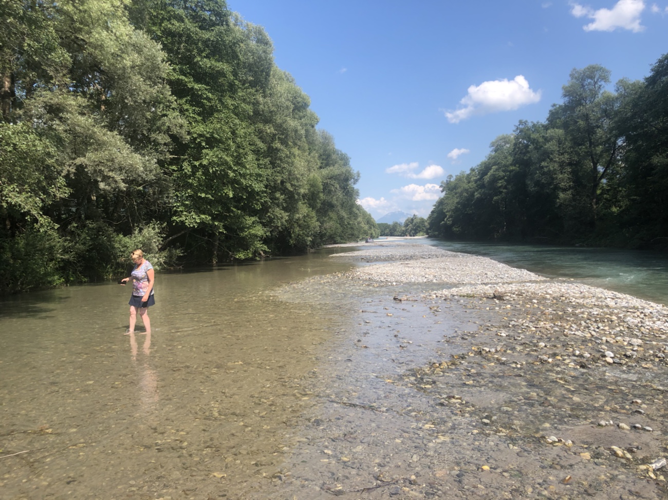 Wir kommen auf dem Rückweg zum Auto an der Isel vorbei, ein in ein steinernes Bett verlegter Fluß, der ziemlich schnell und unruhig daher kommt. Hier könnte man sicherlich raften oder Kanu fahren. Ich stelle mir meinen Freund Bodo vor, der zuhause in Deutschland Drachenbootrennen z.B. auf der Ruhr fährt. Selbst bei ‚Vollgas‘ würden die wohl schnell rückwärts aus dem Ort gespült werden. 😊 Hinter dem Ort fließt die viel kleinere Drau in die Isel, die quasi genau an der Stelle ihren Namen einbüßt und als Drau weiter in Richtung Kärnten fließt. Das ist gegebenenfalls noch ein Plan von uns: Auto stehen lassen und mit dem Rad die Drau entlang Richtung Villach und dann die Gail hinauf zurück in Richtung Hermagor – mal wie im Vorjahr mit Gepäck und Zelt. 👍🏻