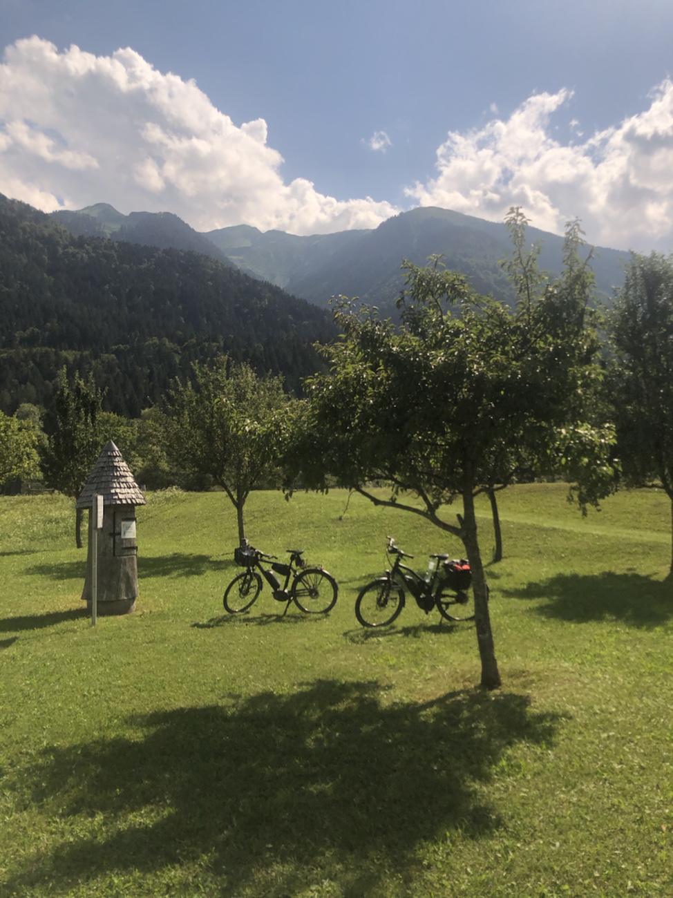 Am nächsten Tag machten wir uns auf zur ersten Tour mit den Rädern. Von unserer Pension in Jadersdorf ging es durchs Gitschtal hinauf nach Weißbriach, dann talabwärts nach Hermagor und wieder zurück. Der Radweg führte in weiten Teilen an der kleinen Gössering entlang. Der Weg war zeitweise asphaltiert, aber dann auch geschottert. An einem längeren steilen Stück des Weges musste ich an unseren Weg vom Wörthsee nach München denken, als wir von dem Weg abwichen, den Thomas uns empfohlen hatte… als es einen kleinen schmalen geschotterten Weg hinaufging, wo die Räder unserer Bikes trotz reichlich ‚Kampfgewicht‘ durch das Gepäck durchdrehten und unsere Kraft auch nicht ausreichte. So einen Wegabschnitt gab es hier auch – zumindest fühlte es sich so an, was jedoch auch ein Stück weit an unserer etwas mangelhaften Kondition liegen könnte. Das letzte Stück des steilen Abschnitts mussten wir daher zu Fuß absolvieren.