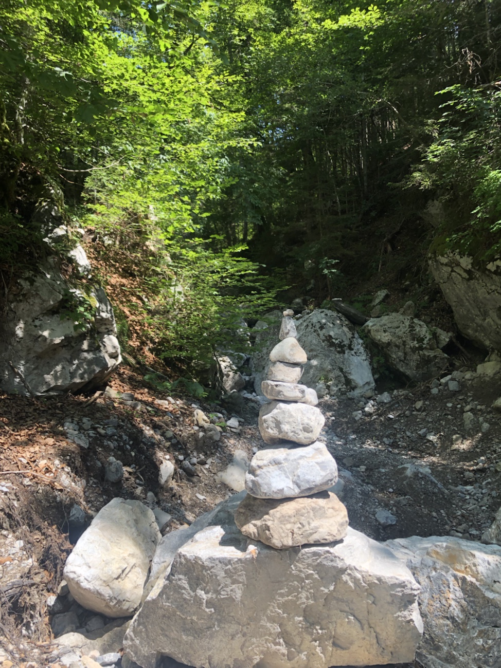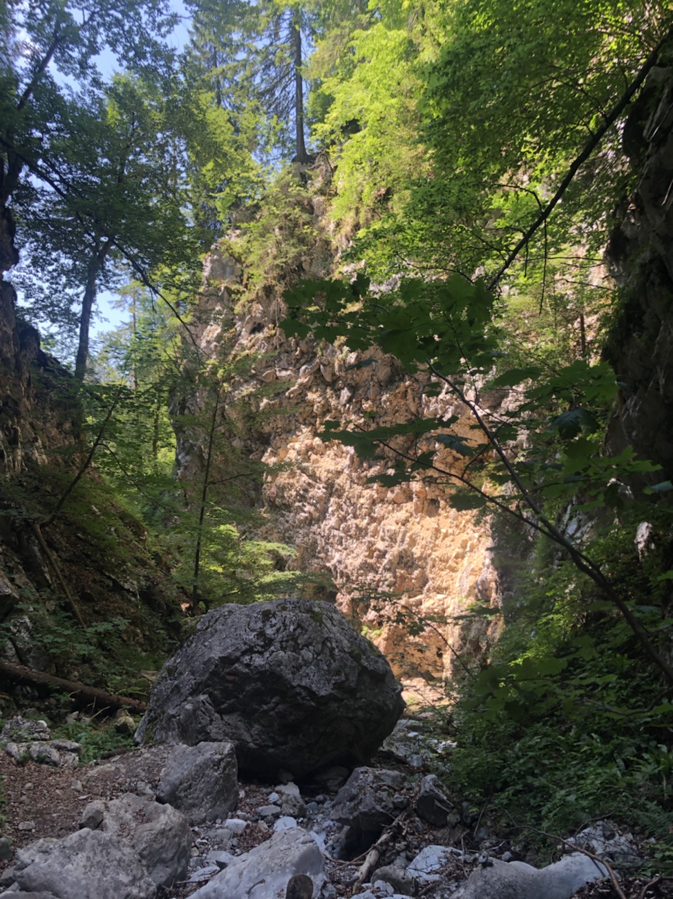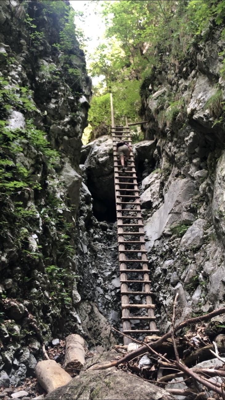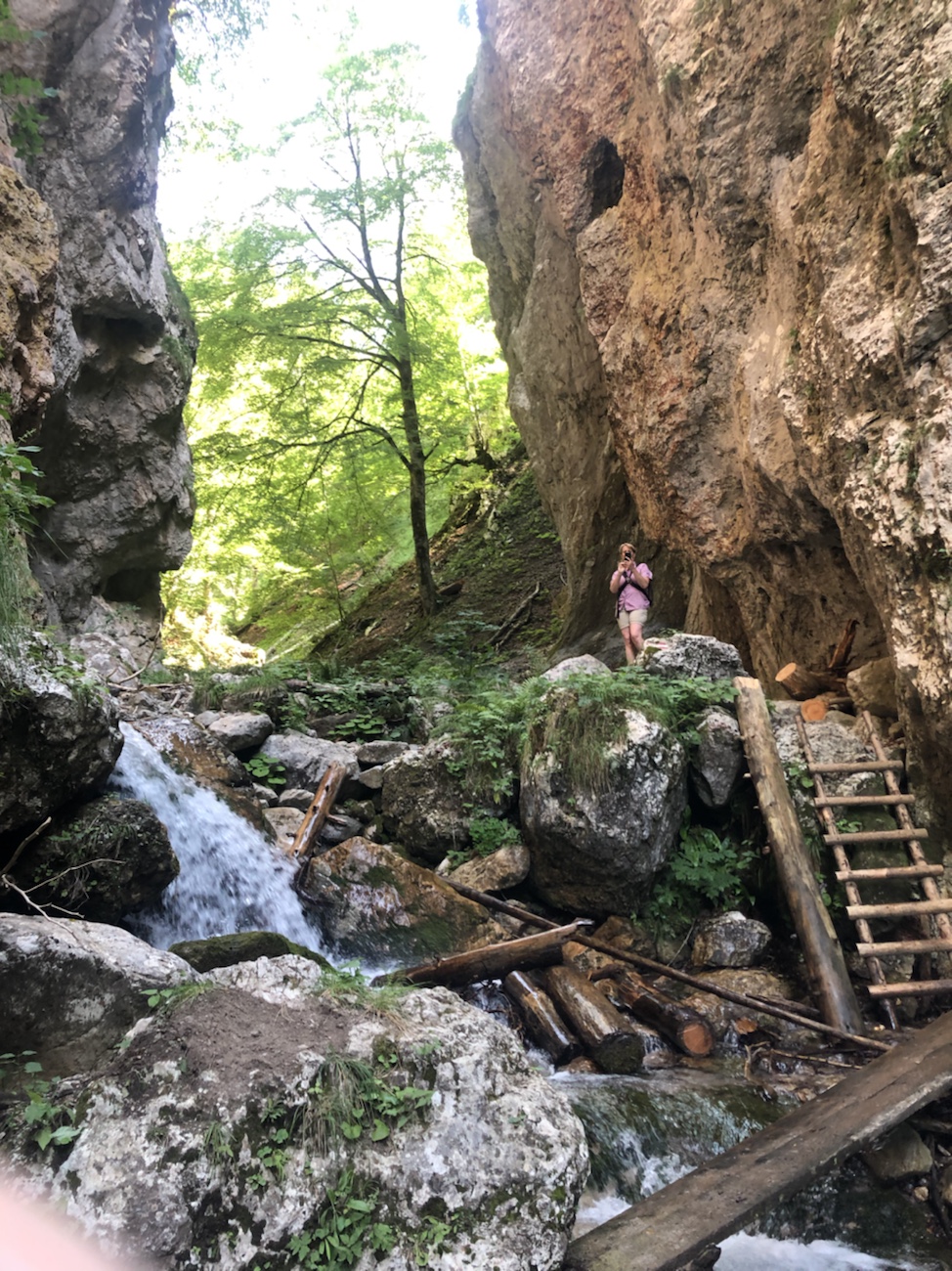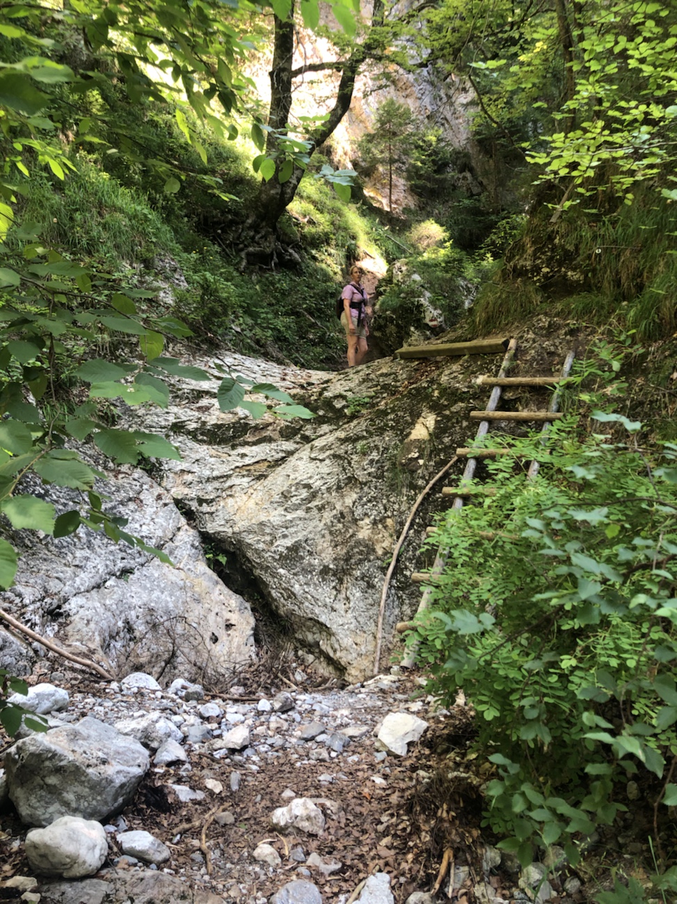 Um Sitzhöcker und Popo mal etwas zu schonen, haben wir am Freitag eine Wanderung durch die Weißenbachklamm direkt in der Nähe unserer Unterkunft gemacht. Auch mal schön, wenn du nur aus dem Haus, rüber zur Brücke gehen musst und schon bist du auf dem passenden und wenigstens halbwegs gut ausgeschilderten Weg in Richtung Schlucht. War es auf dem hinführendem Weg noch fast unerträglich warm, war es in der Schlucht angenehmen kühl. Das Wasser in Verbindung mit den Bäumen machte die Kletterei entlang des Weißenbaches und im oberen Teil durch das ausgetrocknete Bachbett sehr angenehm erträglich. Über den ein oder anderen schmalen Balken balancierend und über mehr oder weniger lange Holzleitern dem Wasserlauf folgend – an manchen Stellen brauchte es schon etwas Geschick und Angstfreiheit. Der Weg zurück führte dann über Forstwege und kleine Klettersteige bis fast vor unsere Pension. Schön war‘s… 😏