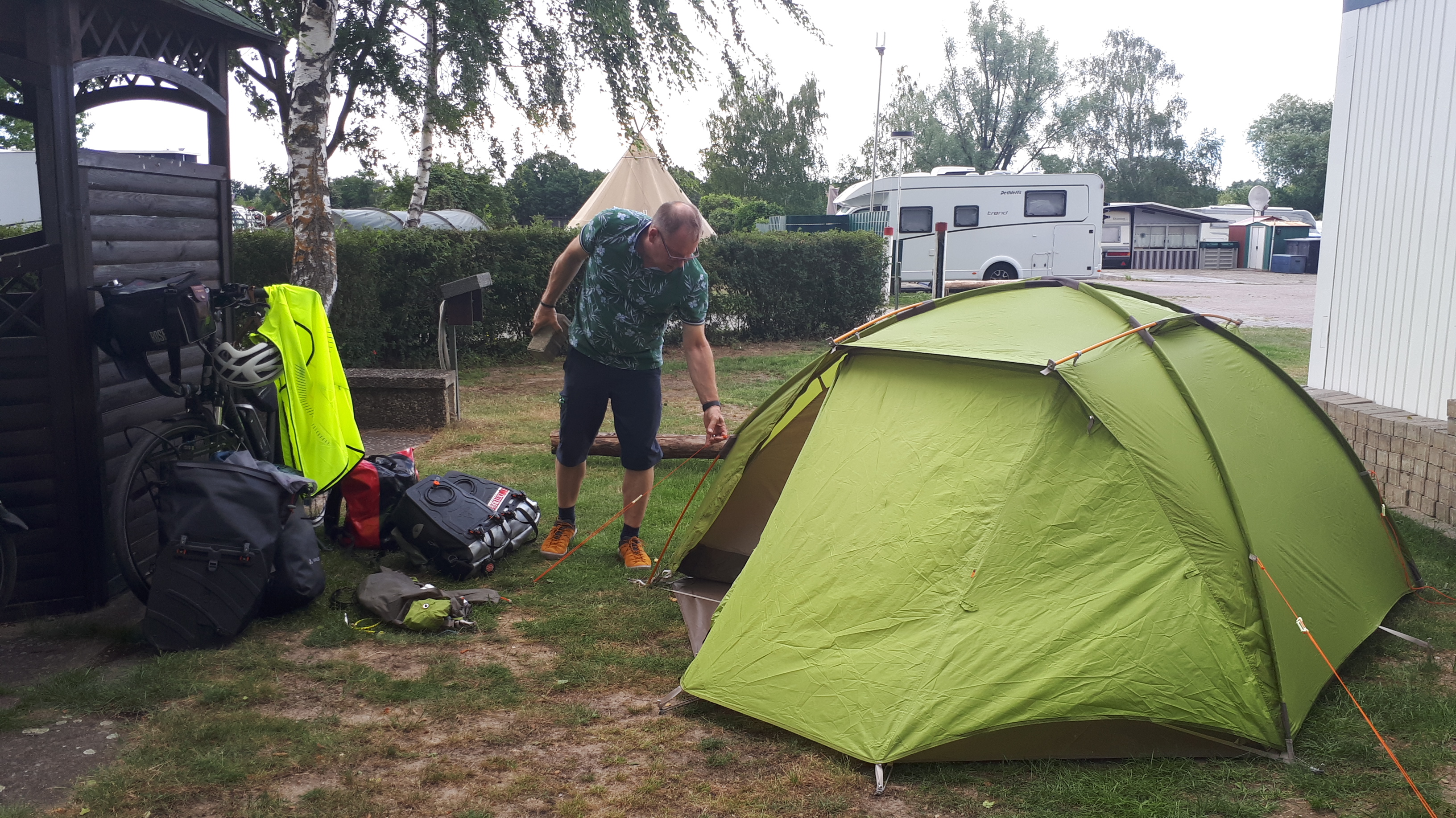 Ohne Lübecker Marzipan wollten wir die Stadt anschließend nicht verlassen und besuchten natürlich auch den Tempel der süßen Sünde, ließen uns Marzipantee, Kaffee und eine überdimensionale Marzipankartoffel schmecken und mit einem Täfelchen Marzipan-Schokolade ‚für unterwegs‘ in der Lenkertasche verließen wir den Laden und suchten noch eine Fahrradwerkstadt auf. Ein neuer Spritzschutz für die hinteren Bleche wurde montiert, da ohne diesen Schutz der gesamte Bereich des Gepäckträgers immer völlig verdreckt war. Noch ein paar Schräubchen, Unterlegscheiben, Muttern und Befestigungsbänder eingepackt (ich hatte mein extra mit Bedacht gepacktes Notfallpack zuhause vergessen) und dann ging es in Richtung Scharbeutz, wo wir unser Zelt für die Nacht aufschlagen wollten. Es taten sich mal wieder die Schleusen auf und das ging quasi bis zum Timmendorfer Strand so weiter. Jetzt sind wir in Scharbeutz auf einem netten Campingplatz und freuen uns auf die 75 km in Richtung Fehmarn. Die Wettervorhersage ist gar nicht schlecht – bisher… 😉